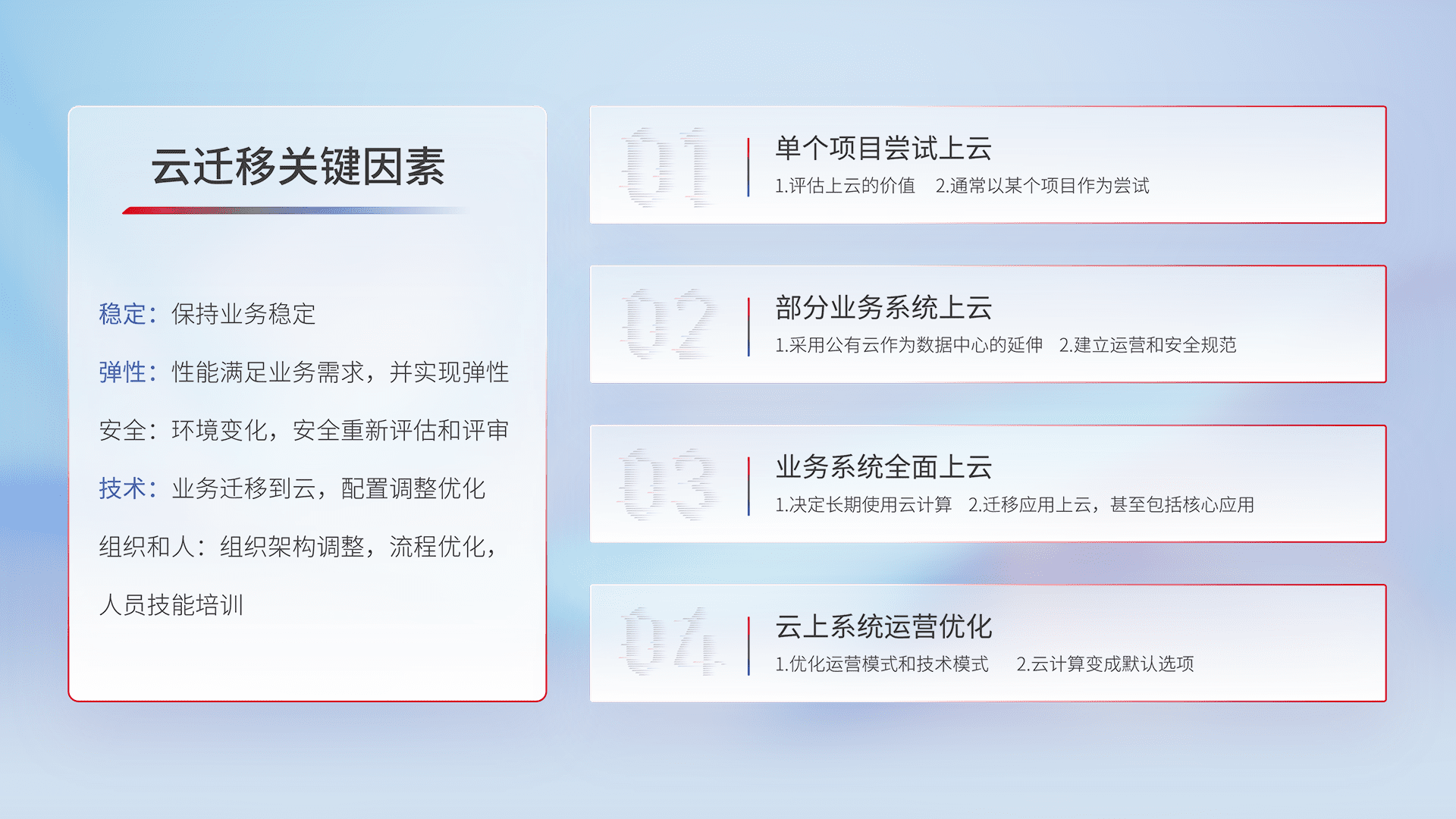 结合实际业务,,,从规划设计、、、、云平台选型、、、云原生改造、、、数据迁移、、集成交付,,,迁移全过程为客户识别最佳上云路径,,,做好风险识别管理,,设计网络架构、、身份权限、、、、安全审计合规、、、、操作审计、、日志审计、、监控告警策略、、多站点容灾设计等,,,,对云上基础设施进行整体规划,,,提升IT治理水平,,,以满足弹性、、、、高可用、、、、高性能的需求。。