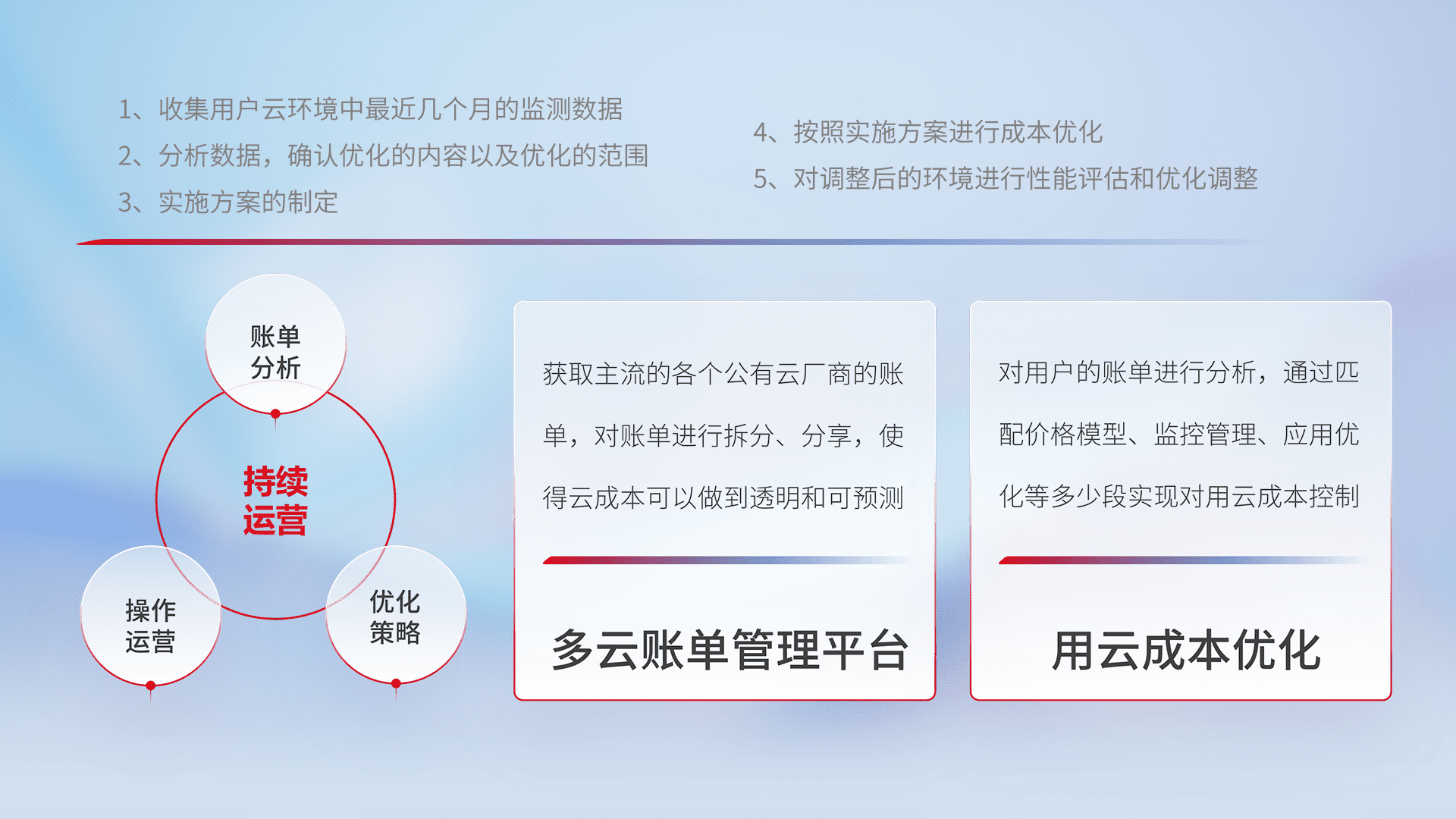 通过多云纳管,,以统一的资源数据模型把客户的云资源进行抽象和封装,,,进而实现对多云资源的统一操作,,,,保障云资源管理的可靠性、、、稳定性与可用性。。。。量身定制化运维内容,,,配置、、、、开发运维、、、、补丁管理、、、备份、、监控、、、认证和访问管理、、、审计和日常巡检等,,保障在用云过程中的可靠度,,,稳定度以及高可用率。。。